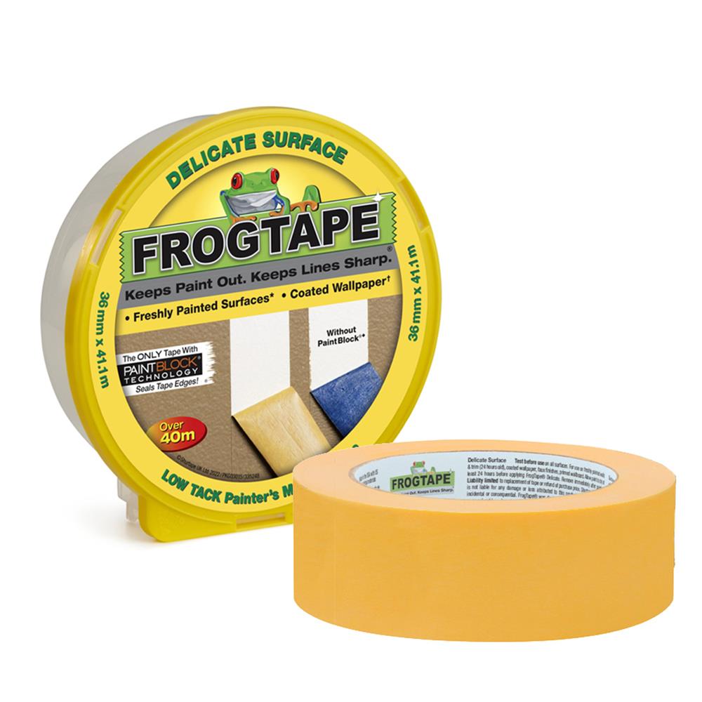 The FrogTape® Delicate Surface Masking Tape is the ultimate painter's product. Offering low-level adhesion to surfaces without any tacky residue left.
